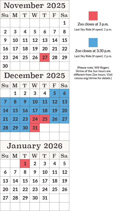 • New Year’s Day 2025: 9 a.m. – 3 p.m., last timed tickets 1 p.m., last Sky Ride (if open) 1:30 p.m., Shrine closed, Electric Safari 5 – 8:30 p.m. (exclusive early entry for Zoo members and their paying guests at 4 p.m.)